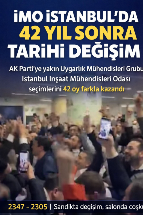 İstanbul İnşaat Mühendisleri Odası İstanbul Şubesi seçimlerinde 42 yıl sonra tarihi bir değişim yaşandı. AK Parti’ye yakın isimlerin yer aldığı Uygarlık Mühendisleri Grubu, 42 oy farkla seçimi kazanarak meslek odasında yeni bir dönemin kapısını araladı.