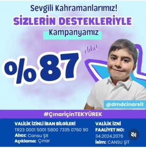 Duchenne Musküler Distrofi (DMD) hastası Çınar Şit için başlatılan valilik izinli yardım kampanyasında önemli bir aşamaya gelindi. Aile tarafından yapılan açıklamaya göre kampanya yüzde 87 seviyesine ulaştı.